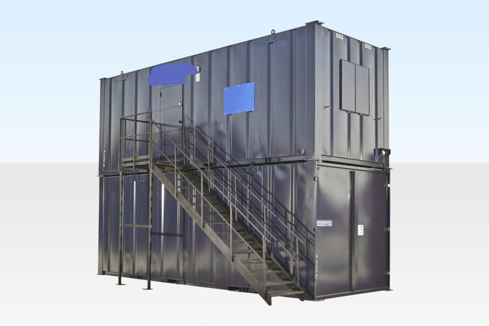 The staircase bolts directly to fixings incorporated into the pedestrian door sill of the upper cabin. The landing provides a platform at the door entry point. Handrails are included for safety during ascent and descent.